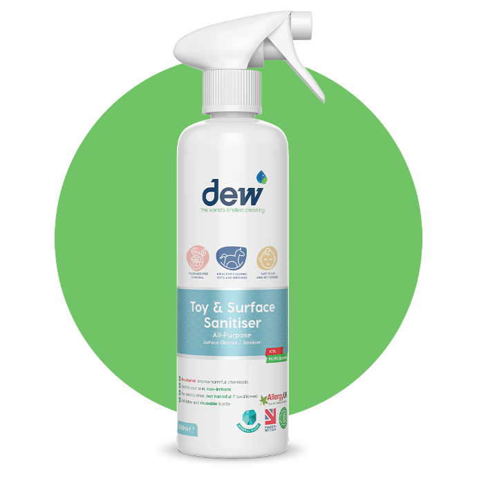 Dew Toy & Surface Cleanser is a high-quality surface cleanser with strong antimicrobial qualities. Our mineral-based formulation, utilising electrolysed water, produces excellent cleansing and its effective antimicrobial action does not promote resistant strains - making it perfect for use to cleanse your little one’s toys, feeding and play areas.