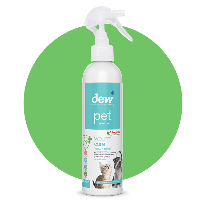 Dew Pet Wound Care is a gentle, fast acting, antibacterial treatment for your pets’ abrasions, irritations and other skin issues. The active substance in our first aid antiseptic spray is approved for ‘Product Type 3’ applications, which means that it has passed all necessary UK/EU testing for use in veterinary hygiene. Dew is pH balanced, non-toxic, non-stinging and 100% safe if licked or ingested.