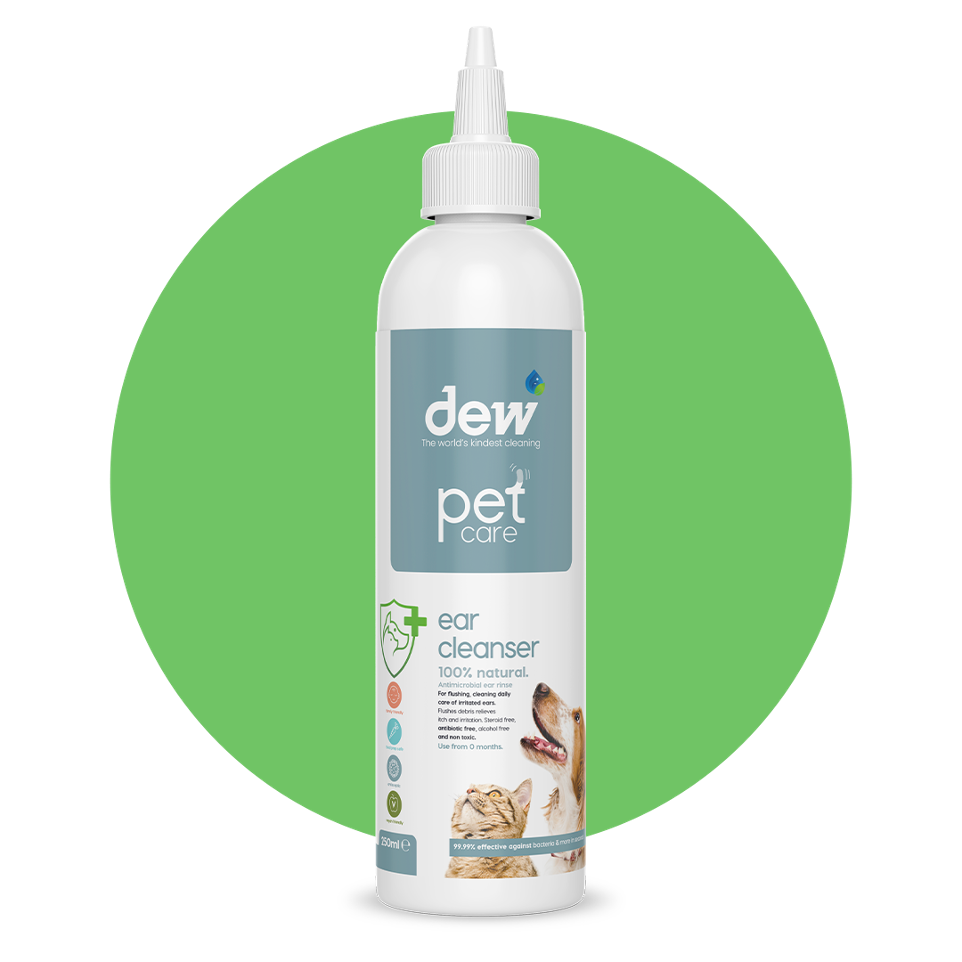 Our Dew Pet Ear Cleanser is 99.99% effective against bacteria and other pathogens. The perfect antimicro- bial ear rinse for flushing or cleansing daily. Our Ear Cleanser helps to stop head shaking and prevent itchy ears, reduces ear odour, removes wax, dirt and help to prevent ear infection in dogs and cats.
