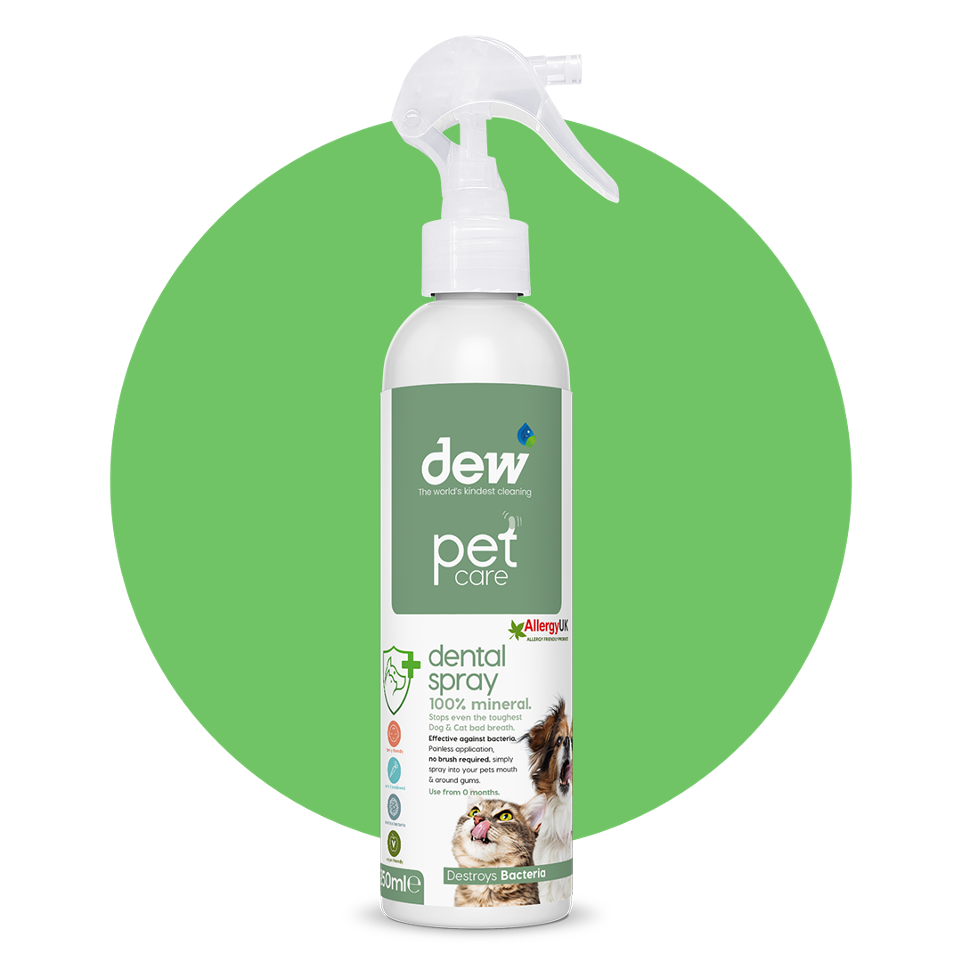 Our Dew Pet Dental Spray helps to stop even the toughest dog and cat bad breath and its 99.99% effective against bacteria too. Our Mouthwash Dental Spray is painless to apply - with no brushing required. It’s simple so simple to use, gently hold your pet’s head and lift their lips on one side, spray Dew Pet Dental Spray into their mouth (against their teeth is fine). Repeat on the other side of their mouth and you are done!